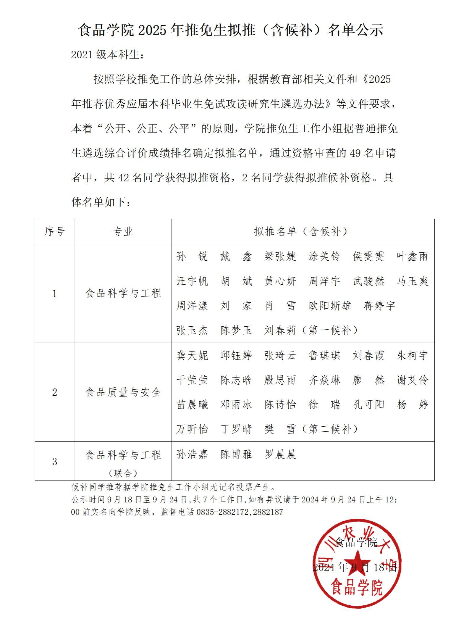 导航痕迹 tyc5997太阳集团 食品学院 首页 本科生教育 日常管理 正文 专业设置 日常管理 课程建设 教学研究 大学生校外实践教育基地 食品科学与工程专业工程教育认证 食品学院2025年推免生拟推(含候补)名单公示 2024年09月18日 15:58 点击:[] 附件【食品学院2025年推荐优秀毕业生免试攻读研究生遴选公示.pdf】已下载次 上一条:关于开展2024年大学生创新创业训练计划项目中期检查工作的通知 下一条:食品学院2025年推荐优秀应届本科毕业生免试攻读研究生工作通知 【关闭】