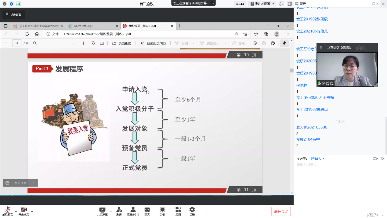 中午13:00汤瑞瑞老师通过线上教学围绕“中国共产党发展党员细则”向大家讲述了发展党员的要求,发展党员的5个阶段和25个环节,并指出发展党员时坚持把政治素质放在首位的工作原则。最后,她还对入党积极分子们提出了严格的要求,希望同学们可以早日成为思想上入党、行为上入党、组织上入党的中国共产党党员。