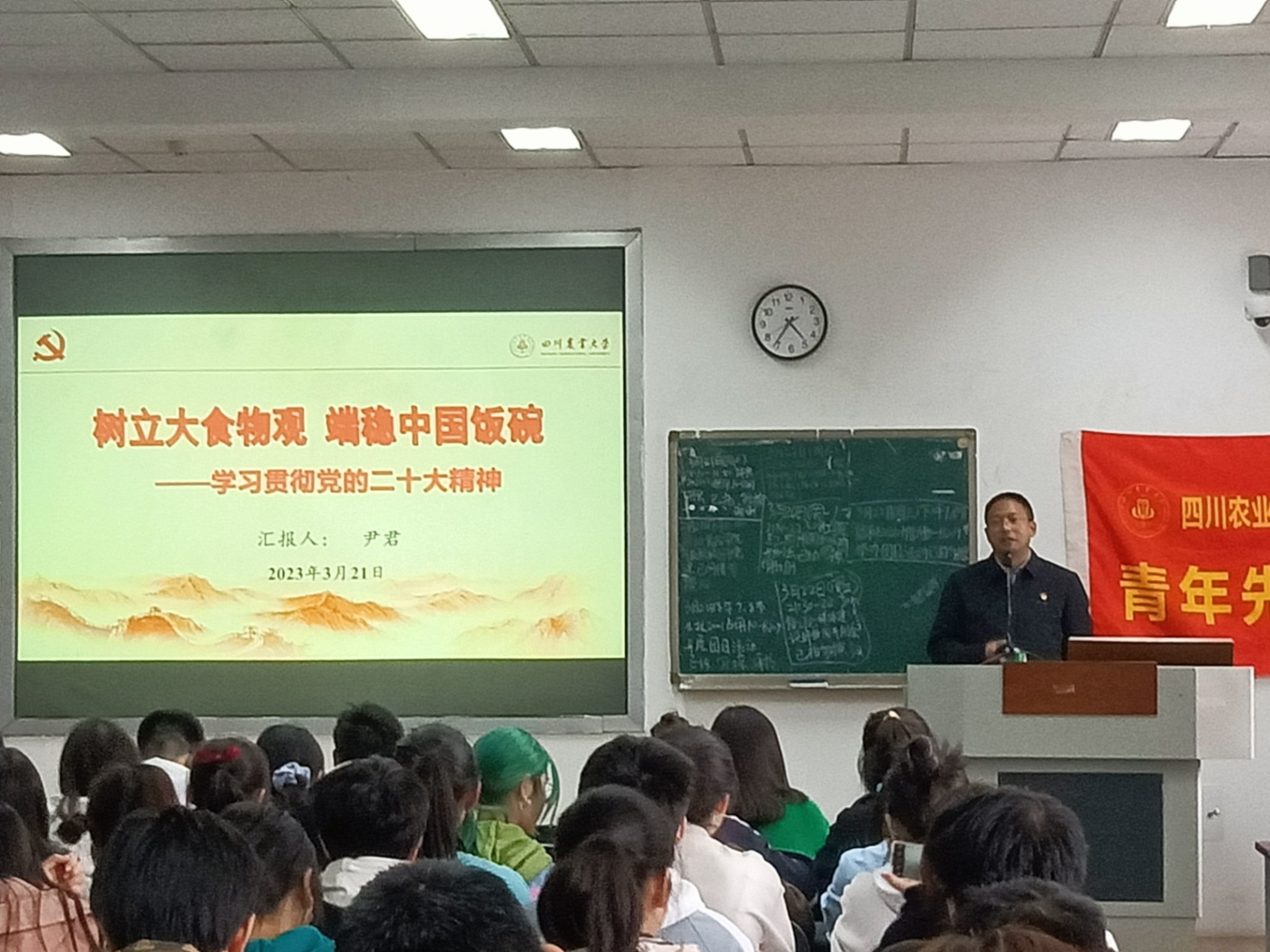 尹君老师以《党的二十大精神解读》为主题,开堂便提出了“树立大食品观 端稳中国饭碗”的中心思想,结合本院专业,明确了入党积极分子对当前形势的认识,引发入党积极分子对自身应当如何发展的思考。随后,尹君老师从党的二十大内容概述,大食物观的内涵解读,新时代食品学子担当这三个方面,对“树立大食品观,端稳中国饭碗”进行了进一步的解读。尹君老师从16个方面展示了中国新时代十年的伟大变革,说明其在党史,新中国史,改革开放史,社会主义发展史,中华民族发展史上的重要里程碑意义。同时,尹君老师对大食品观的丰富内涵进行了深刻解读,说明了其在军事、经济、政治上的重大意义。最后,尹君老师鼓励入党积极分子们听党话,跟党走,怀抱梦想脚踏实地,立志做有理想,敢担当的时代好青年,并对入党积极分子做出树立、践行大食品观的要求。