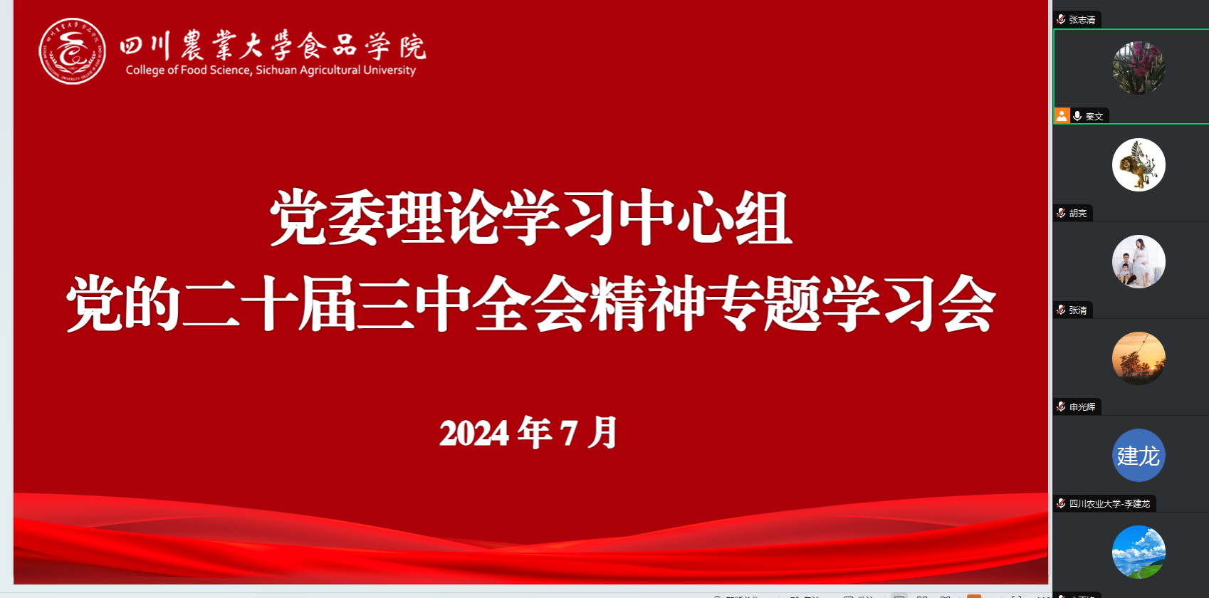 会上,秦文领学《中国共产党第二十届中央委员会第三次全体会议公报》《中共中央关于进一步全面深化改革、推进中国式现代化的决定》,秦文要求全体党员同志持续深入学习贯彻党的二十届三中全会精神,做到学深学透、融入日常、抓在经常,确保取得实效,并将学习成果转化为推动学院事业发展的强大动力。食品营养与健康系主任陈洪、学院党委办公室陈放分别分享了党的二十届三中全会精神的学习心得体会。