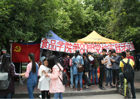 18日上午11点,由食品学院青年先锋队组织的第80期党校实践活动成果展在二区主干道如期举行。