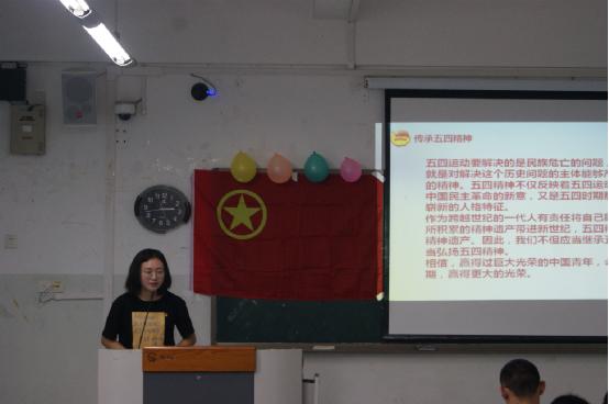 活动开始,主持人宣布会场纪律并介绍本场嘉宾,说明此次团日活动的主题和目的。紧接着进行了大会第一项内容,全体起立,齐唱团歌。接着,主持人对五四运动背景、历程及对我国的意义等相关内容进行了讲解。然后播放了有关五四运动的视频,在场各位无不深受触动。最后游戏答题环节,不仅活跃了现场肃穆的气氛,还加深了同学们对于五四运动以及其精神等的理解。大会接近尾声,主持人组织了数字大战和击鼓传花游戏,使同学们对此次课堂上所学到的内容进行了复习。最后,同学们再次全体起立,齐唱团歌。至此,活动顺利结束。