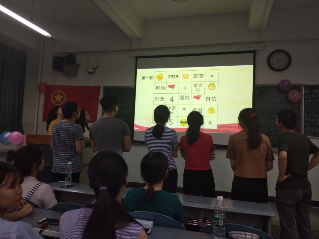 本次团日活动形式多样化,从一首团歌拉开帷幕。接着全体团员在天赋新青年公众号上进行简短的学习,目的在于借助现代科技信息技术,提高学习效率。随后观看了“五四青年精神”“新时代中国实力—以现在的高铁发展历史”为主题的两部视频,以此启发同学们思考,同时也为之后的提问环节设置悬念。然后在主持人的带领下,活动进入紧张刺激、考验人反应力的游戏环节,通过对与该团日活动相关字词的瞬时记忆,让同学们感受新时代中国实力的变化。最后再次以唱团歌的形式结束此次团日活动,团日活动取得圆满成功!