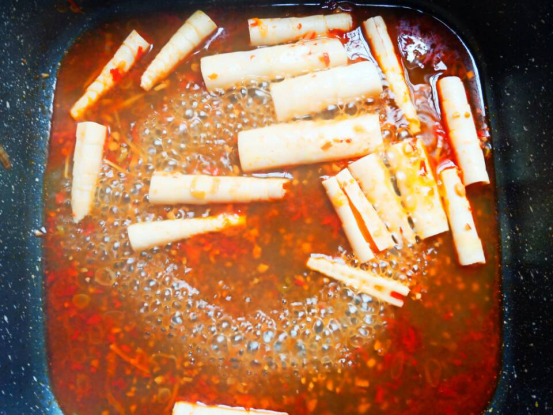 最佳笋友是一种创新的笋类零食,他将竹笋与秘制馅料完美地结合在一起,打造出一种地道的南方美食诱惑。“最佳笋友”团队首先进行竹笋的前处理,先将其用清水清洗,然后采用直径0.8cm的吸管对竹笋进行分段掏空,然后部分笋用李锦记蒜蓉辣酱进行焖制,另一部分笋使用李锦记卤水汁进行卤制,经过队员们的不断摸索、不断尝试,最终得到卤水汁与水的比例为1:10。在队员们炒制蒜蓉辣酱的时候,那诱人的香气一出来,就吸引了其他参赛团队的成员纷纷前来。