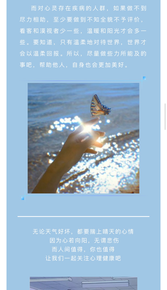 活动时长21天,意在向更多同学普及心理健康知识,让大家在竞争激烈,压力越来越大的学习生活环境下,了解心理疾病,预防心理疾病,同时也对心理疾病有正确的认知理解,帮助存在心理疾病的同学,让越来越多的同学感受到大学生活中的爱与温暖。