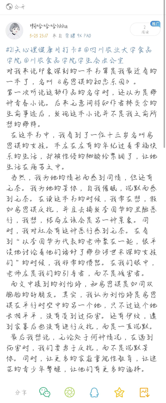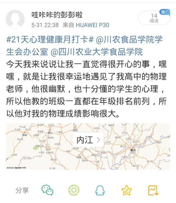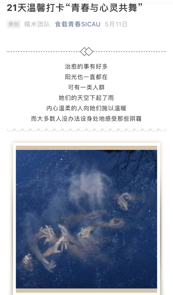 2020年5月14日,由我校食品学院学生会办公室举办的“青春与心灵共舞”心理月打卡活动正式开始。受到疫情的影响,本次活动采用线上开展的形式展开。