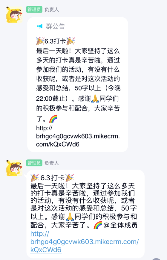 此次活动按照打卡天数的多少,在活动结束后会为参加活动并且打卡合格的同学赋予二课分,这无疑激励了同学们认真打卡,保证活动质量的同时提升同学们的参与积极性,形成一道美丽的网络风景线。有了办公室成员们的认真工作,此次活动得以公平公正公开地开展。每一天的情况汇报,及时的答疑和突发情况的处理,都彰显了我校同学的综合能力之优秀。