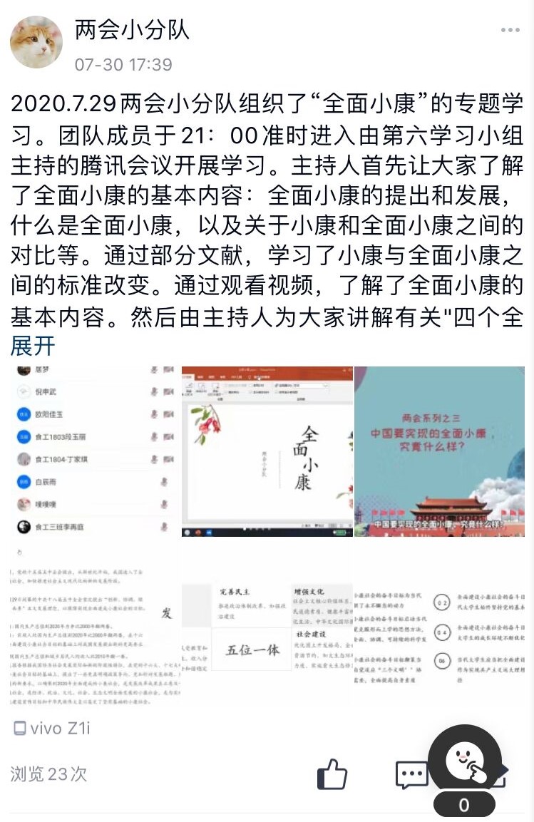 为了更好贯彻两会主导精神、加强自我思政素质,tyc5997太阳集团食品学院“两会”小分队团队决定开展关于两会学习的社会实践活动,以便深刻理解两会精神,学习并加以贯通,为社会主义建设和发展、祖国实现伟大复兴贡献出一份力量。2020年8月17日,暑假社会实践两会小分队在线上举行了中“健康中国”的专题学习。此次线上活动共有由团队共15位成员共同参与学习。