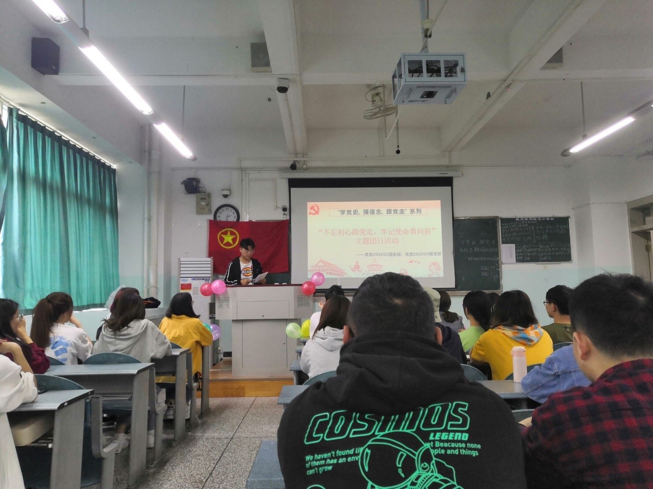 此次活动名称为“学党史,强信念,跟党走”之“不忘初心跟党走,牢记使命勇向前”.团歌唱响,活动正式拉开帷幕。主持人带领同学们一起,用图文和视频的方式回顾了我们党从新民主主义革命时期到如今的建设社会主义现代化强国的光辉且艰辛的历程。接着,学校党员老师和刚入党的党员同学通过视频向团员们分享了入党的动机,并对我们团员青年提出三点期望,首先团员青年要以学习为本,将学习专业知识和思想进步结合起来放在首位;要加强锻炼,身体是我们革命的本钱;要端正思想,关心国家大事,提高思想觉悟。随后进行的是活动第四部分:党史知识竞赛。两班代表团按序应答,其余同学积极思考,党史问题难易设置得当,既考察了同学们对党史的学习成果,又激发了大家对中国共产党历史的深入学习。为了传承红色基因,致敬革命先烈,团日活动小组的同学通过角色扮演的方式,还原了黄继光英雄用身躯堵机枪口的英勇事迹,将活动推向了高潮。最后,食质本科生党支部宣传委员李燕涛同志总结点评了本次活动,并分享了个人向党组织靠拢的经历。
