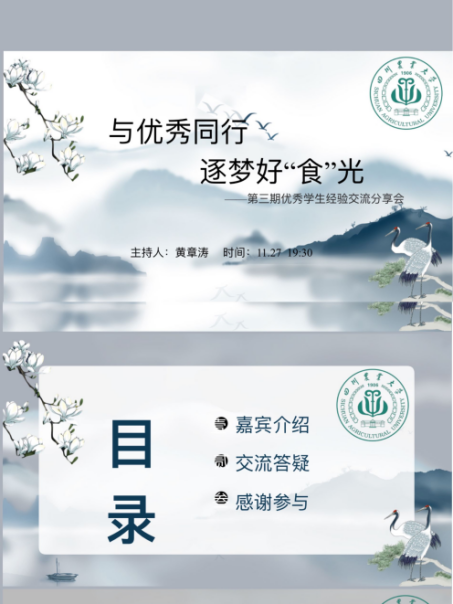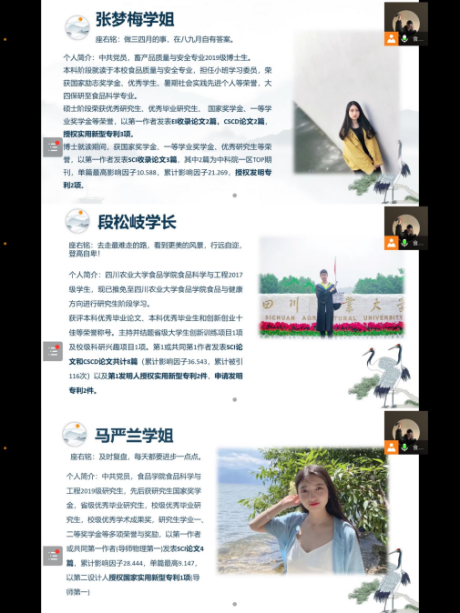 2021年11月27日,食品学院“力源·食光学海”优秀学生经验交流系列分享会—“与坚持同行,雨后彩虹”硕博分享于腾讯会议顺利举行。本次会议特邀张梦梅、段松岐、马严兰3位优秀的博士生和研究生作为嘉宾出席,食品学院共有269名学生通过腾讯会议线上观看本次分享会,会议持续2小时。