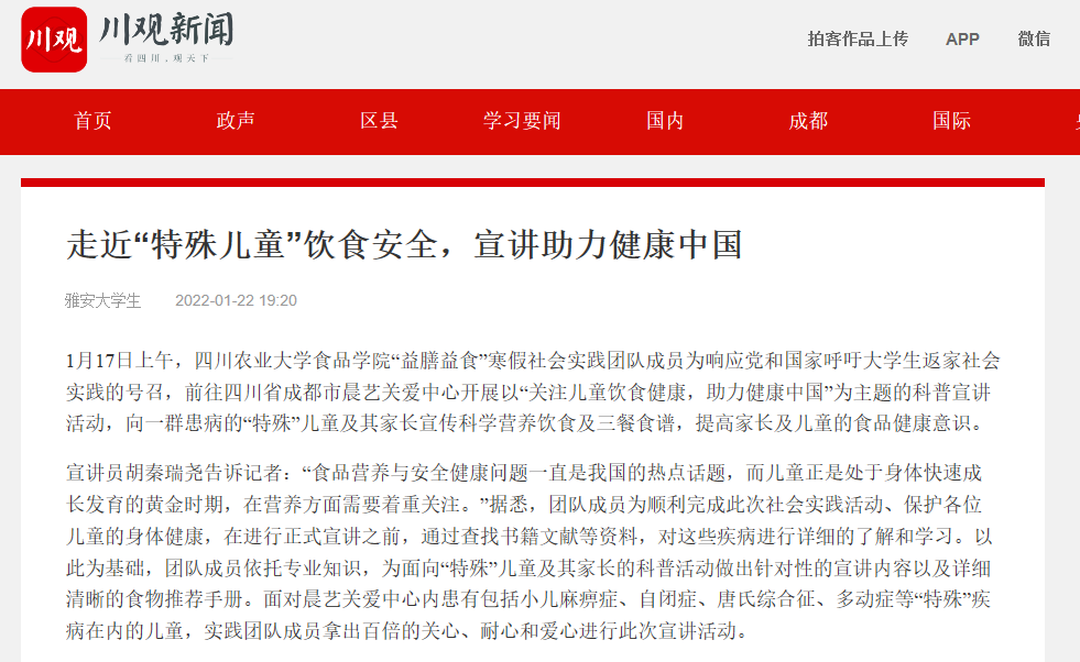 1月17日上午,tyc5997太阳集团食品学院“益膳益食”寒假社会实践团队成员为响应党和国家呼吁大学生返家社会实践的号召,前往四川省成都市晨艺关爱中心开展以“关注儿童饮食健康,助力健康中国”为主题的科普宣讲活动,向一群患病的“特殊”儿童及其家长宣传科学营养饮食及三餐食谱,提高家长及儿童的食品健康意识。