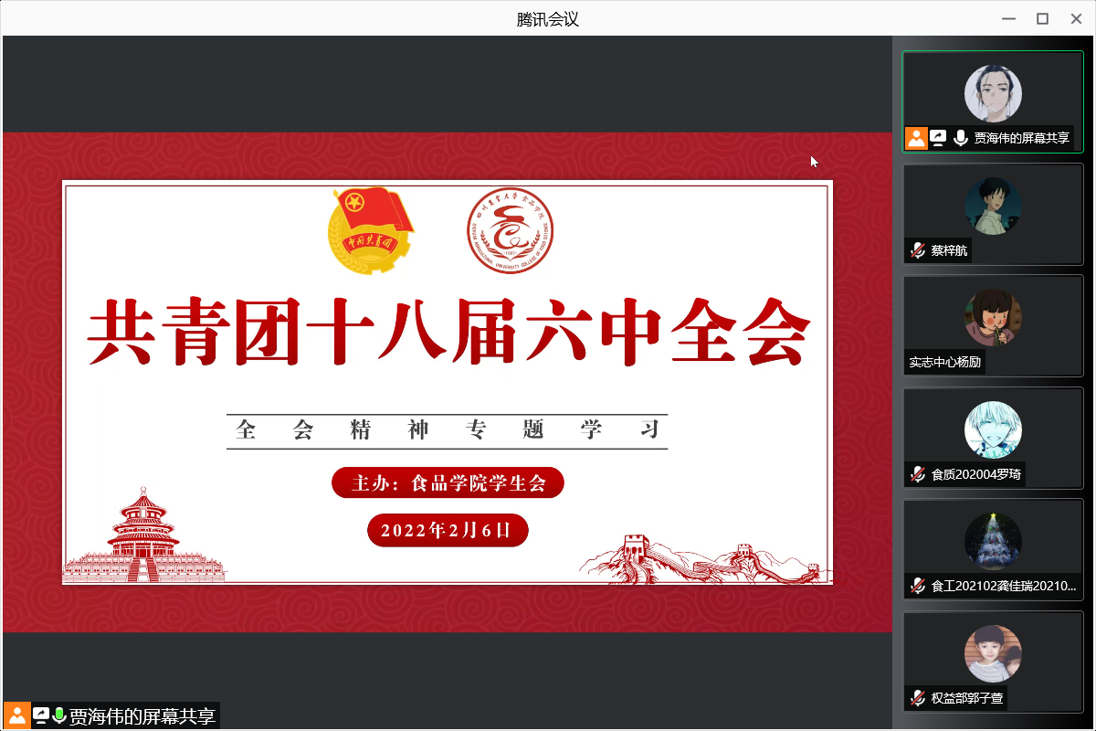 1月24至1月25日共青团中央十八届六中全会在京召开。食品学院党团学组织掀起了学习热潮。2月6日,食品学院学生会全体主要学生干部通过腾讯会议线上开展共青团十八届六中全会精神专题学习会。