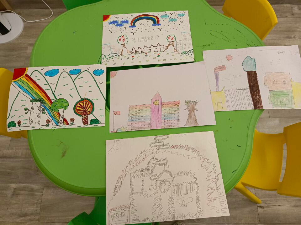 小朋友完成的以“我心目中的学校或家”绘画创作部分作品。中国青年网通讯员苗晨曦摄
