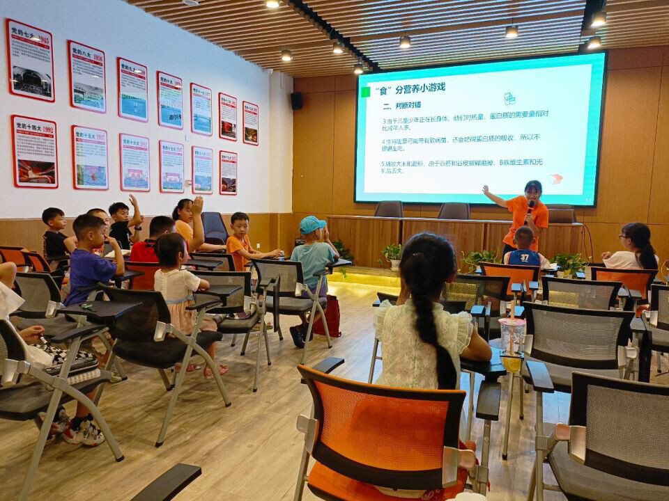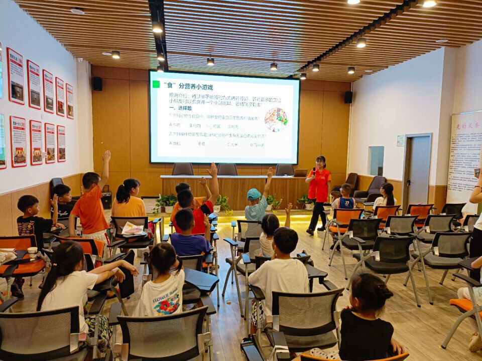 队员万昕怡带小朋友做“食”分营养小游戏,回顾所学知识。中国青年网通讯员苗晨曦摄