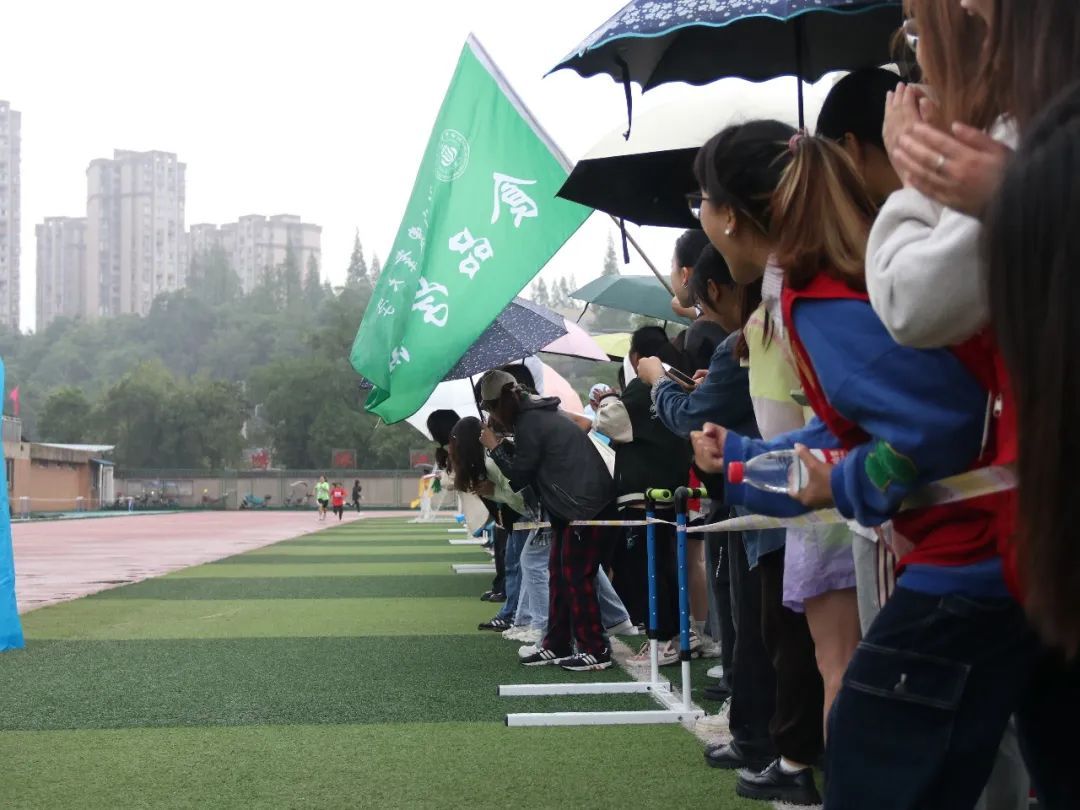 赛场上活动的,除了充满生机的绿色,还有鲜艳热烈的红色,他们是食品学院为校运会招募的志愿者们。为了确保运动员能够比的安心、赛的有力,志愿者们分工明确,“站岗”“接送”“撑伞”“呐喊”......奔走的身影忙碌且有序。啦啦队气势十足、热烈激情,击鼓声,喝彩声,他们在冷雨中喊出热血沸腾,喊出心潮澎湃,食品院的胜利不能没有他们的努力,他们用行动为运动员们撑起一把巨伞,提供了坚实的后盾,也彰显了真正的团结拼搏。