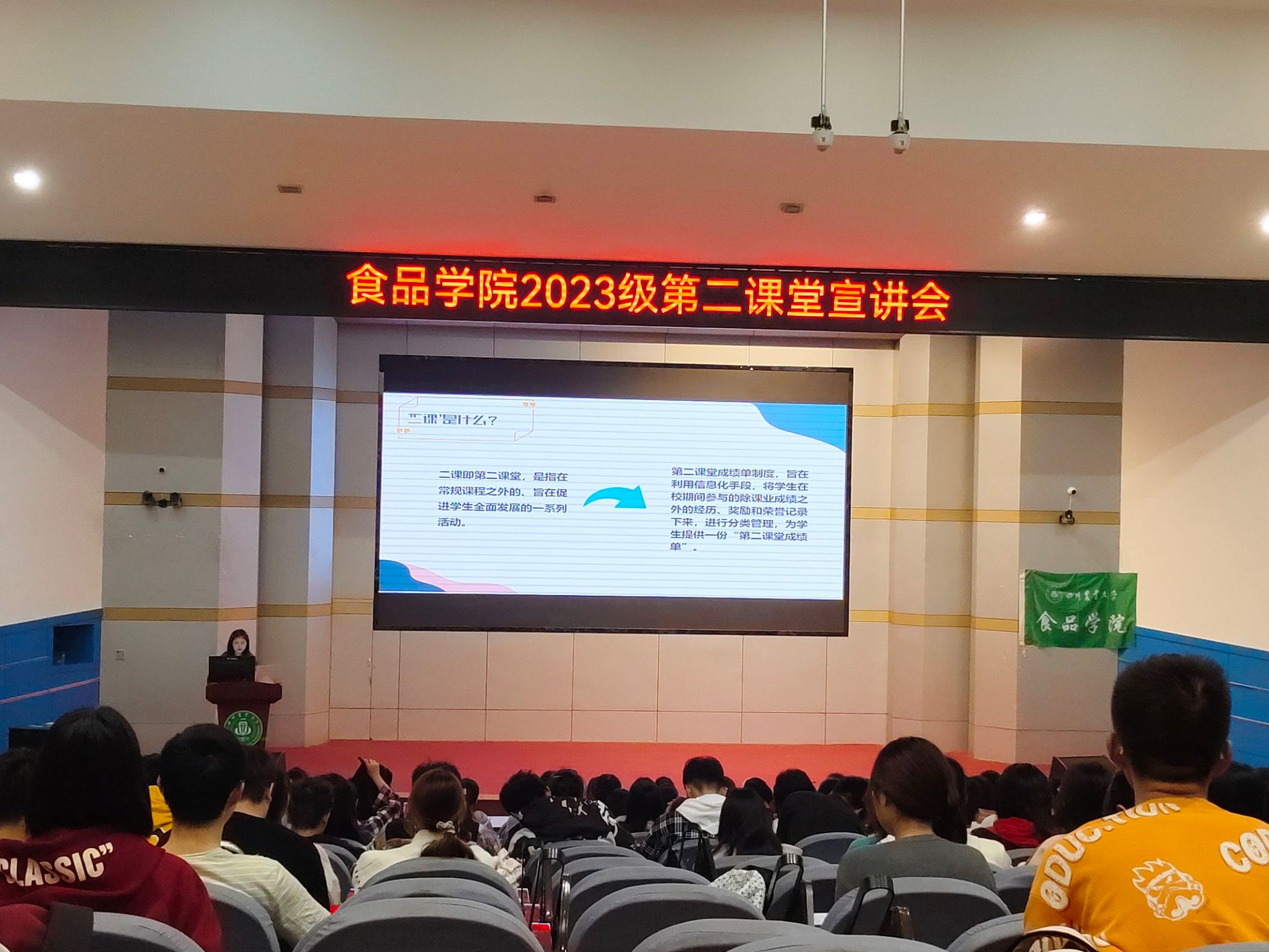 为促进学院“第二课堂”成绩单工作的推进,增强学院新生对“第二课堂”成绩单制度政策的认识,食品学院团委第二课堂成绩单运营中心于10月17日在逸夫楼小礼堂召开“第二课堂”成绩单制度宣讲会。食品学院2023级各小班班委、部分新生和学院学生部门所有新成员参加本次宣讲。