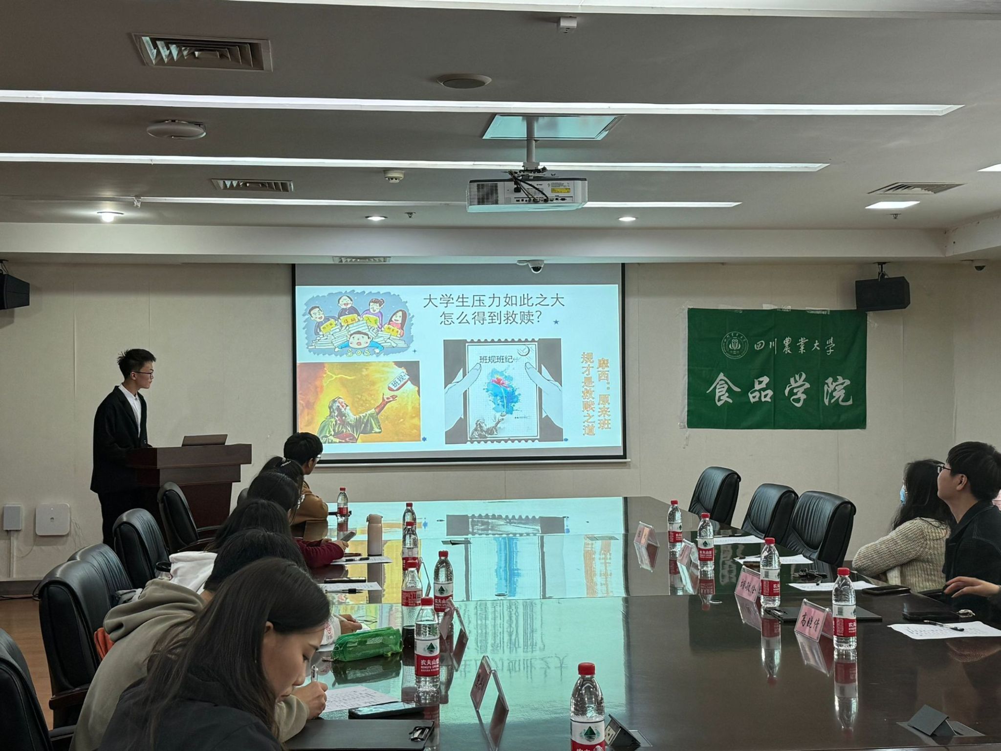 各小班负责人在答辩中展现了本班对班级管理的认识和建议,提出了一系列富有创意的班规设计方案。有的班级注重学习,例如食工三班提出了英语四级的百分百过关率目标,来进一步规划同学们的大学生活、鼓舞同学们的学习热情;食工五班将整个班级比作“青青草原”,每位班干都有属于自己“羊村身份证”,其加强了同学们的身份认同,提高了班级凝聚力。