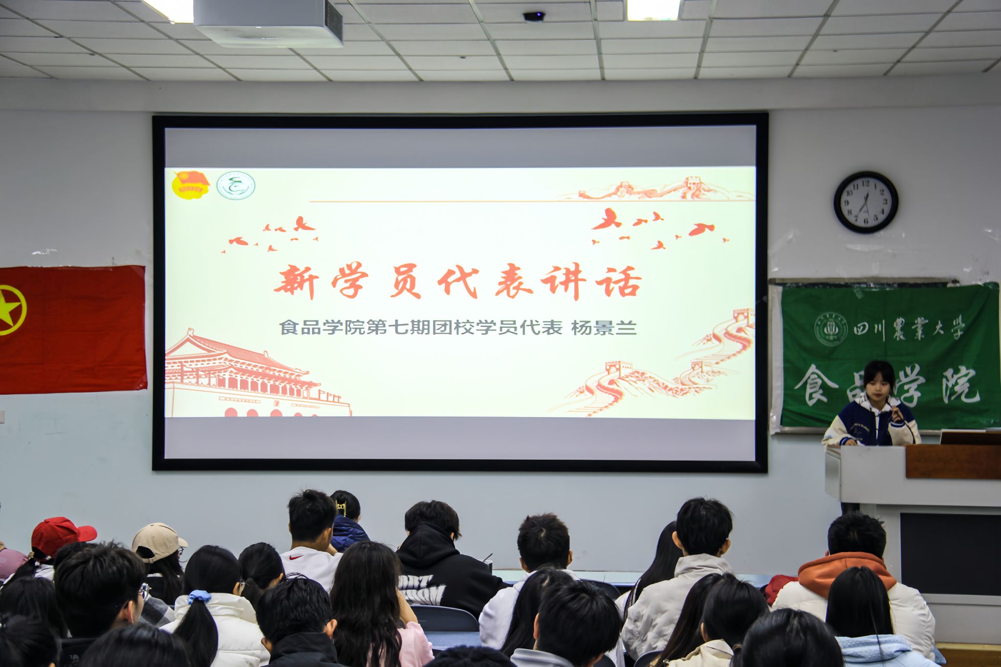 齐唱团歌完毕,食品学院第六期团校优秀学员代表吴昱和第七期团校新学员代表杨景兰,先后从思想引领、理论学习、实践结合出发,鼓励同学们积极尝试,在不断提高自己的思想修养和理论素养的同时,掌握相应的实践技能。
