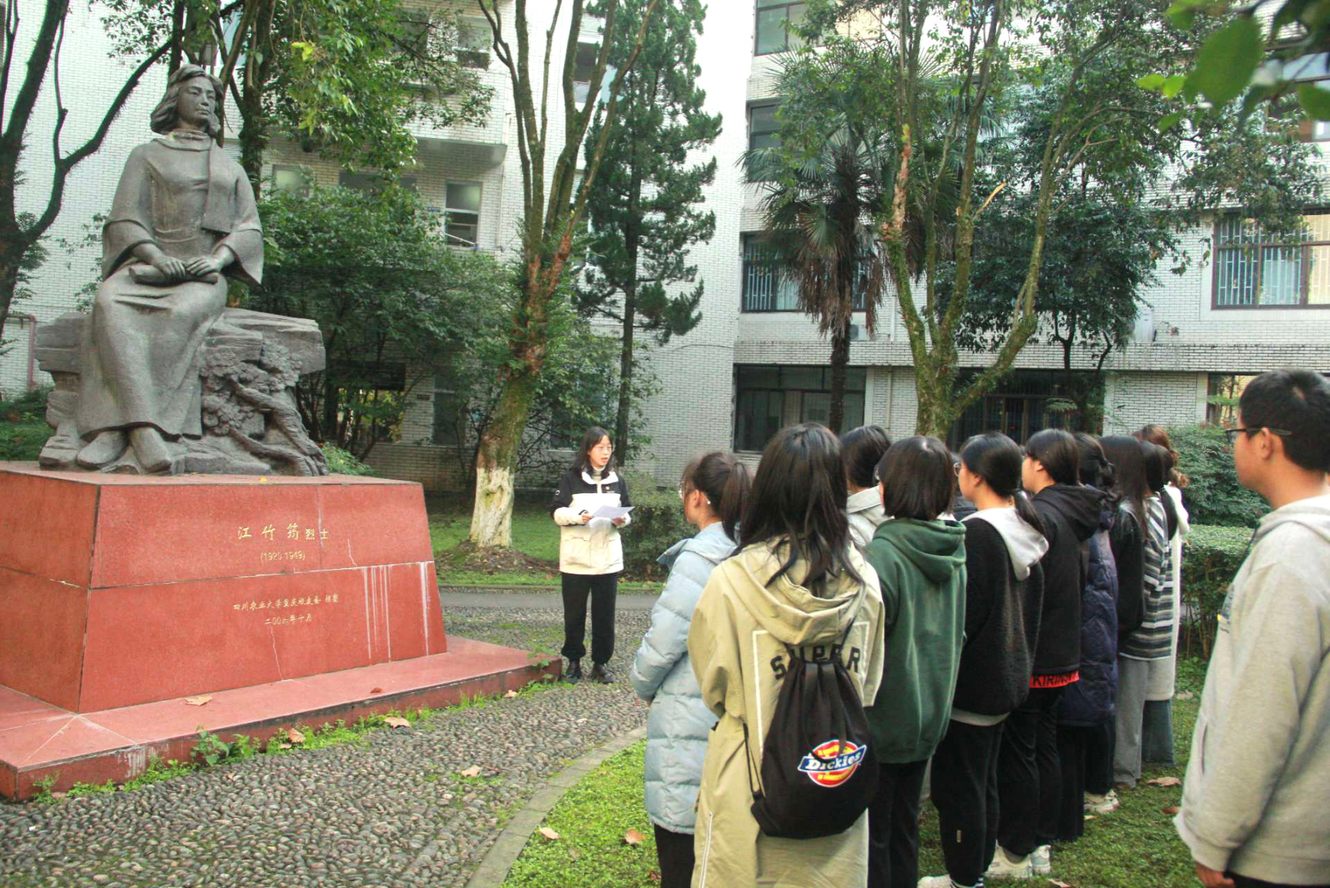 为讲好红色故事,赓续红色基因,让更多同学参与校史学习,罗雅琳带领2023级食质4班团支部,将课堂搬到户外,于11月17日在江姐雕塑前开设了现场课堂,拍摄微视频供班团活动的同学们观看学习。
