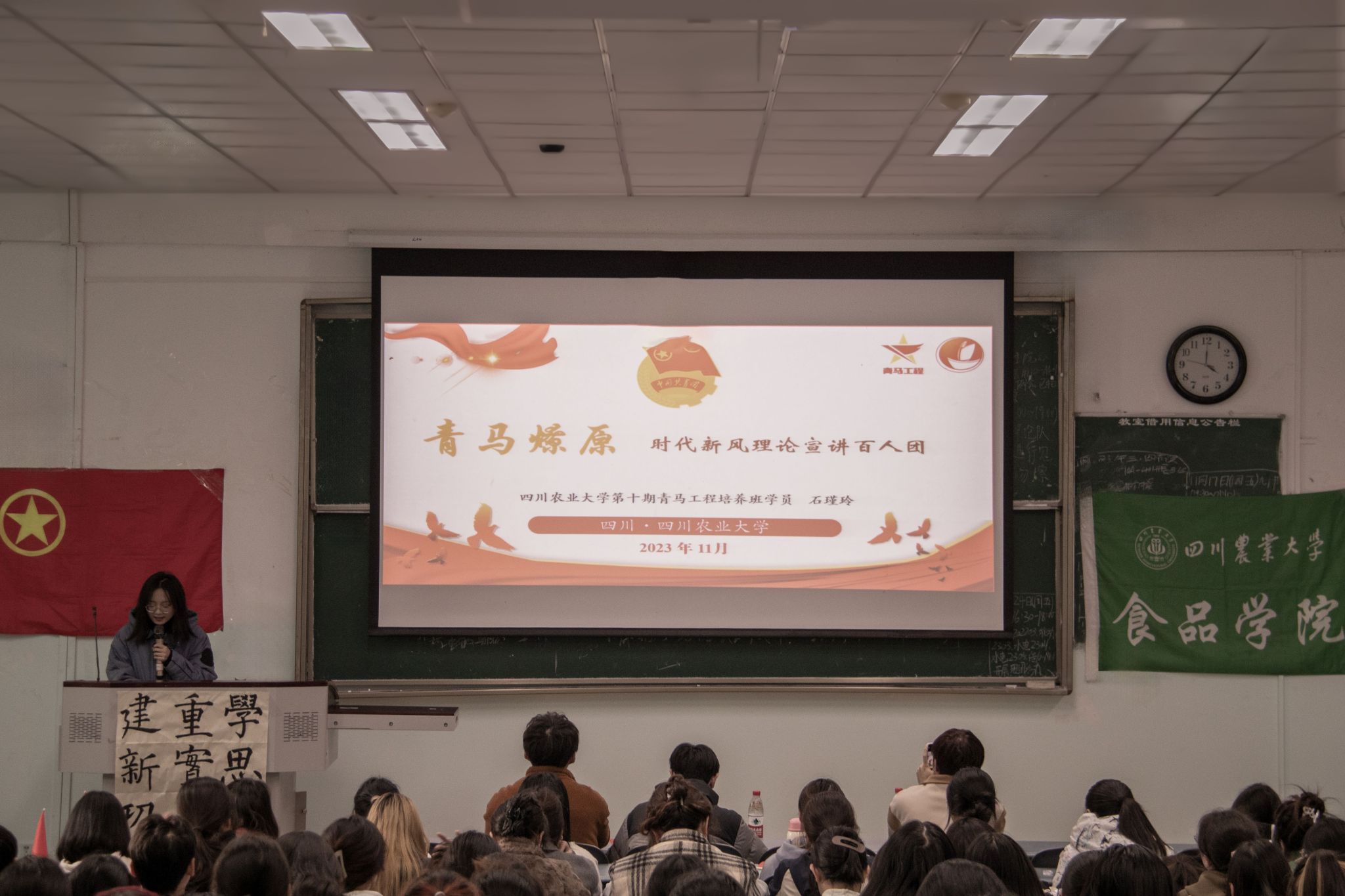 “听·足迹”系列“乡村振兴战略所带来的改变”微视频、食品、生科联合第五期青马班学员自主拍摄的微视频,向同学们展示了如何将将马克思主义基本原理与实践紧密结合。彭俊豪同学表示“通过观看微视频,不仅学习了马克思主义基本原理相关理论知识,还学会了如何将其运用到实际实践中,帮助自己更好的理解和掌握了相关知识”。校第十期青马班学员石瑾玲在宣讲中指出:“作为农林高校学子,我们更要以兴农强农为己任,扎根乡村、情系三农,胸怀‘粮食安全’这一国之大者,为牢牢端稳中国人自己的饭碗贡献青春力量。”