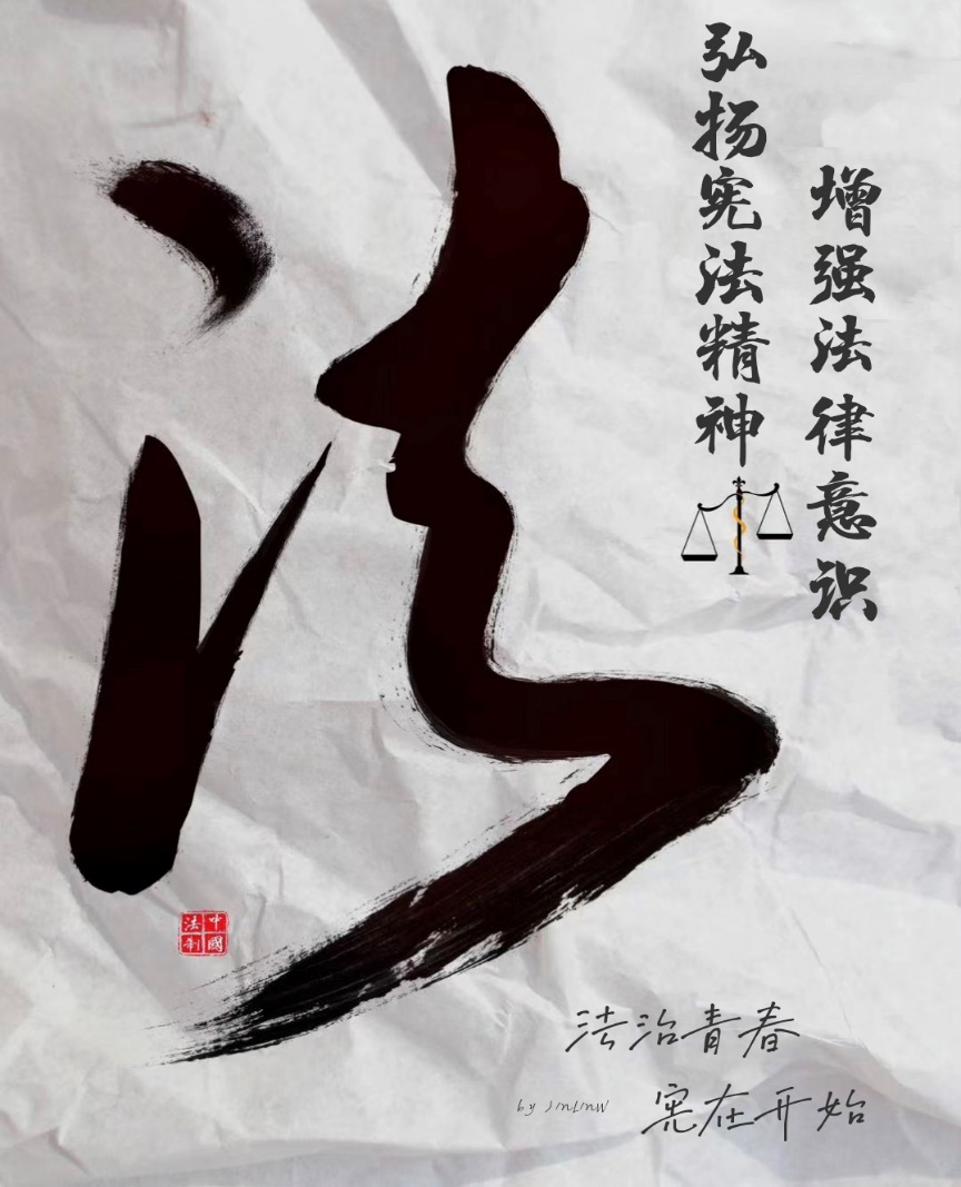 同学们还展现了许多有创意的平面设计作品,将法律精神融入到精美的作品中。平面设计一等奖作品将水墨、书法的中国元素融入到设计之中。作品中以“法”字直接展现设计主题,天平元素使法律的形象更加生动,白纸黑字则体现了法律的清晰明了,说一不二,严肃庄重。作品简单大方,别具一格。