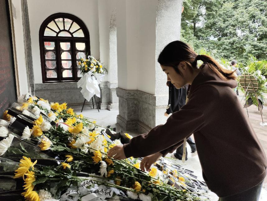 苍苍青山埋忠骨,朵朵白花献英雄。讲解进行至纪念堂,全体志愿者整齐排列,端正仪容,庄严肃立,低头默哀,继而鞠躬。随后向革命英烈献上精心挑选的白花。