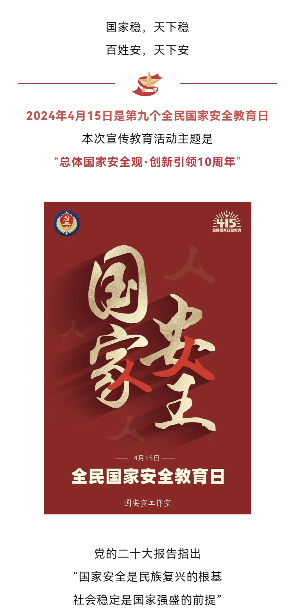 国以安为兴,民以安为乐,国家安全是民族复兴的根基。4月15日,食品学院学生会权益维护部开展了“国安如山,你我化林”线上答题活动,旨在宣传国家安全知识,提升青年守护国家安全的意识。