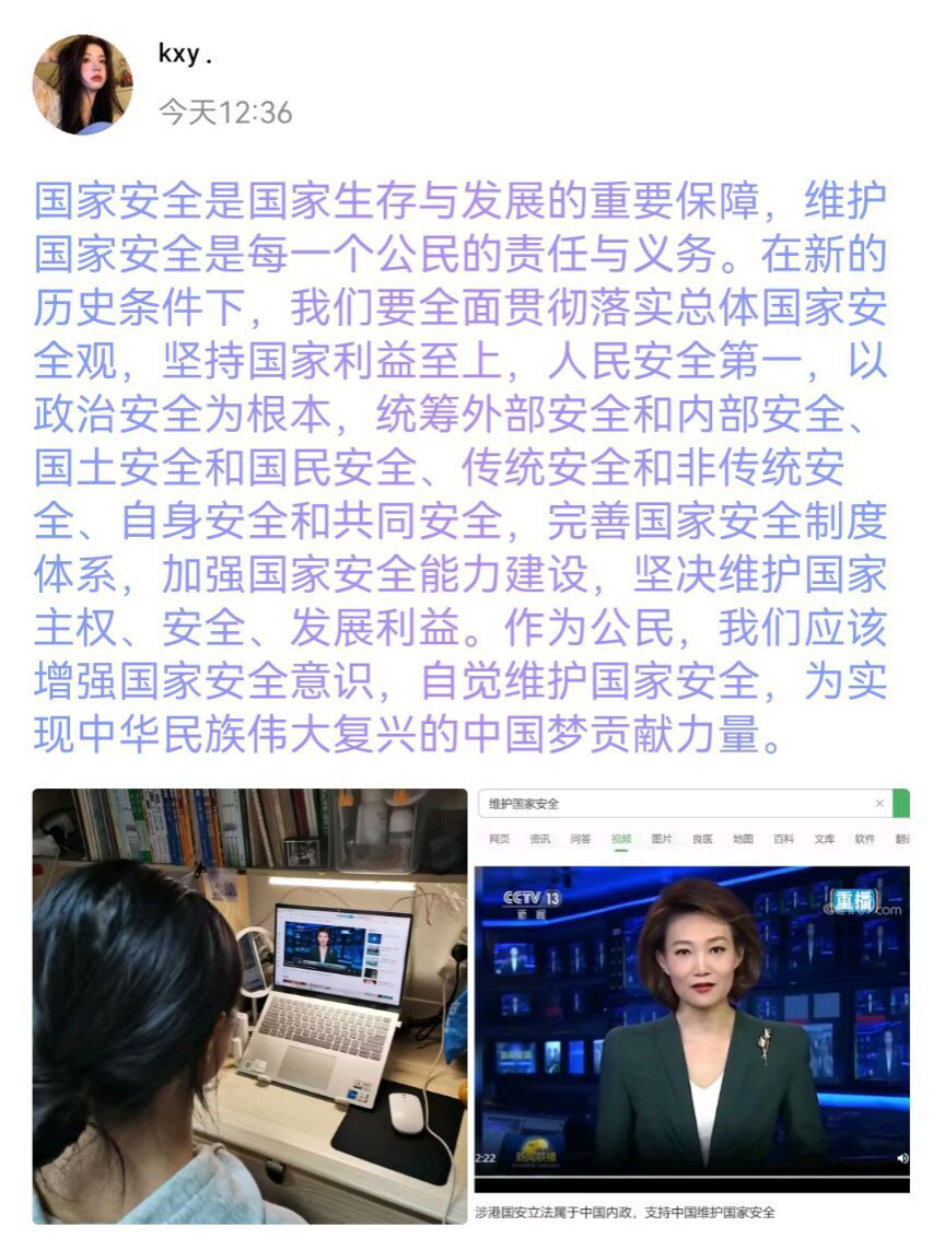活动开始前,部门通过组织观看《国家安全宣传视频》、制作宣传推文等形式大力传播国家安全知识。为进一步巩固相关学习内容、检验同学们的学习成果,于15日开展了国家安全相关答题活动,多数同学取得较好成绩。参与活动的同学感慨道:“观看国家安全现实案例视频后,我才知道国家安全涉及方方面面,还有这么多意想不到的行为间接侵害国家利益,我以后需要更加注意,切实维护祖国的安全。”