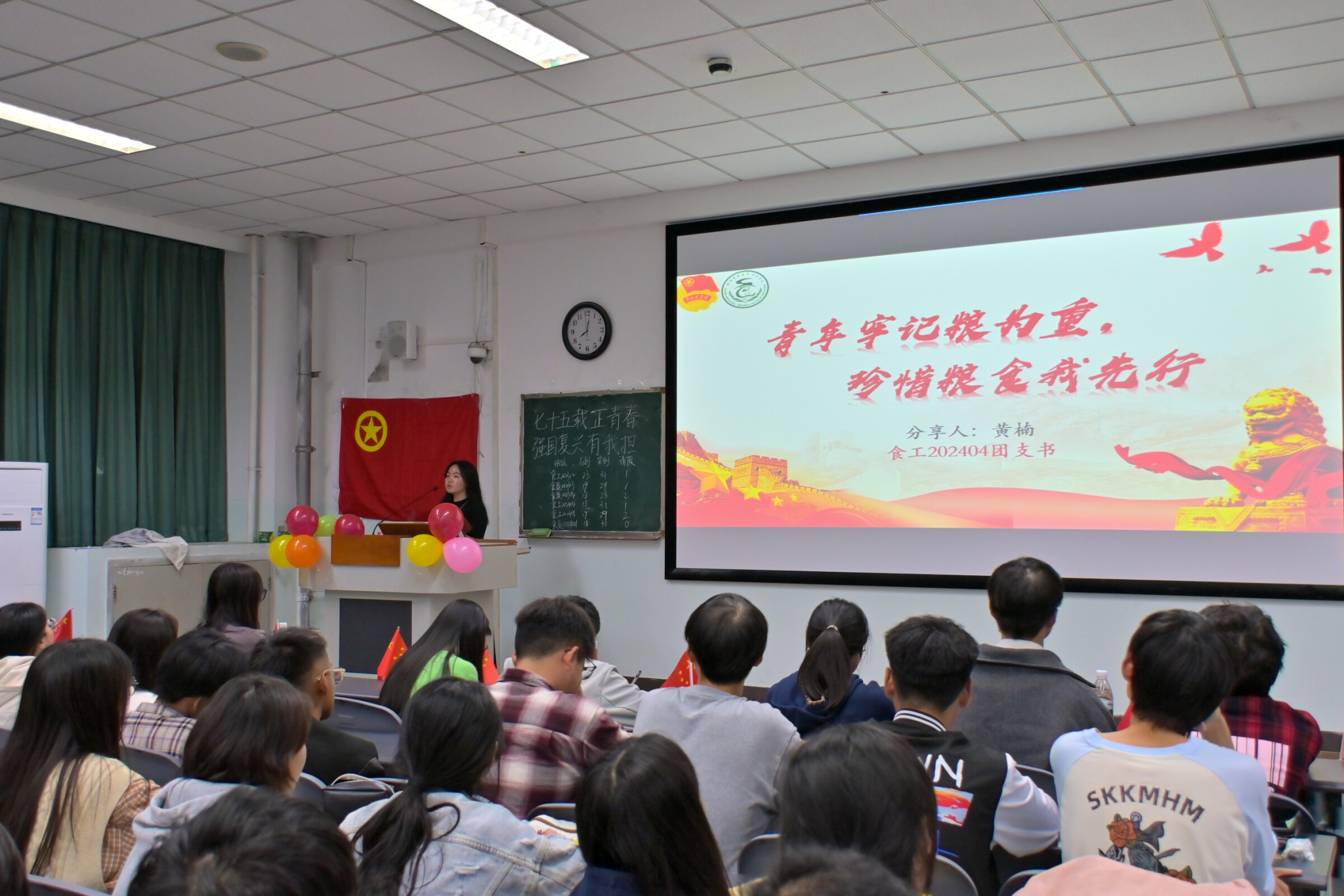10月25日,由食品学院食质202303、食质202304、食工202302、食质202401、食工202404和食工202405六个班级联合举办的以“七十五载正青春,强国复兴有我担”为主题的示范性班团活动在10教A201室顺利举行。