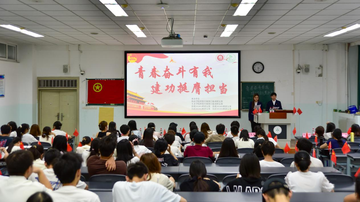 5月26日16:30,由食品学院团委直属部门流动团支部、人文学院团委直属部门流动团支部、食质202401、食质202405、汉语202302、汉语202303班团支部承办的“青春奋斗有我,建功挺膺担当”主题示范性班团活动于十教A-203教室隆重开展,并邀请了食品学院党委办公室陈放老师参与。本次活动旨在通过深入学习领会志愿服务精神、开展一系列丰富多彩的活动,增强大学生思想和行动自觉,肩负青春责任,争做有理想、敢担当、能吃苦、肯奋斗的新时代好青年。