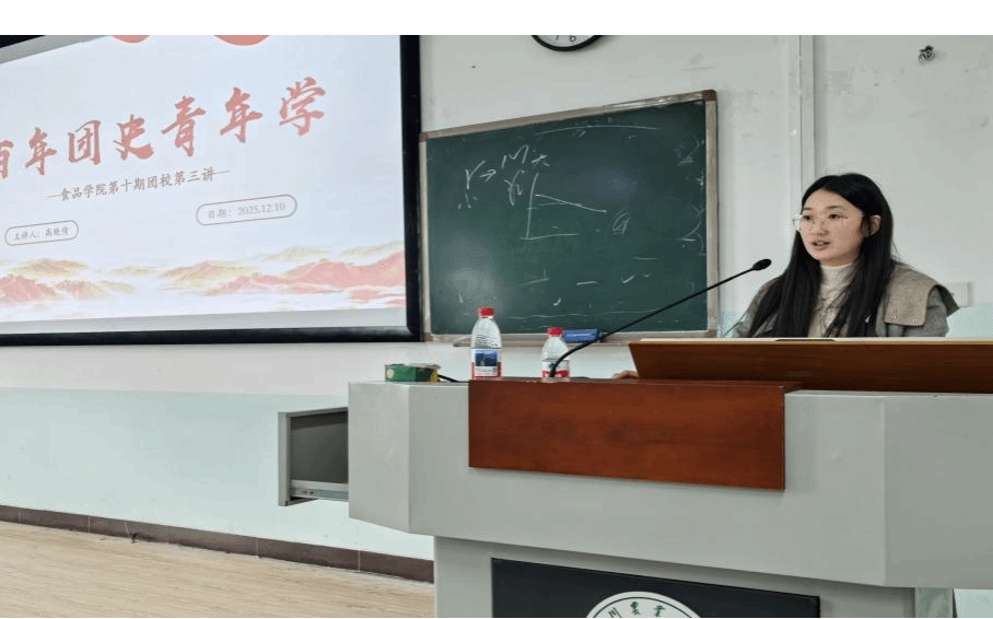 为深入学习贯彻中国共青团的光辉历程与初心使命,引领青年学子坚定理想信念,2025年12月10日,食品学院第十期团校第三讲专题于10-A304开讲,食品学院党委办公室高晓倩老师主讲,入团积极分子及部分团干代表参与了学习,活动由学院团委组织建设与发展中心承办。