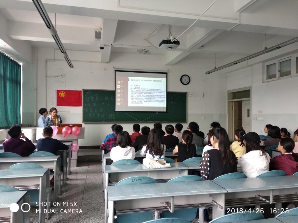 活动以集体起立齐唱团歌开始,接着由蒋悦同学为同学们讲解有关tyc5997太阳集团“第二课堂成绩单制度”实施办法;接着是班长刘荆渝同学和支书魏雪颖同学为同学们讲解第二课堂的一些具体细节;然后是关于第二课堂的问答环节,同学们积极的提问,刘荆渝同学和魏雪颖同学一一为同学们解答。接着进入小游戏环节,同学们玩儿游戏唱歌。最后以集体起立齐唱团歌结束本次团日活动。