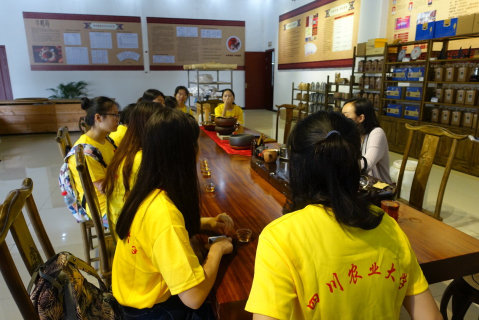 接着,姚姐带领大家参观了制作好的藏茶成品——茶砖,藏茶经过发酵后干燥压制成砖,茶砖易于保存也便于收藏。姚姐倒了泡好的藏茶,大家围坐在茶桌旁,仔细听着姚姐讲述藏茶悠久的历史以及神奇的功效。队长段茂坪向姚姐提出了自己的疑问,姚姐耐心地解答,她说:“如果真的要讲藏茶,那我几天几夜也讲不完。”大家细细品味着藏茶的独特口感与风味,藏茶文化此时此刻变得十分浓厚,成员们对藏茶的了解也多了几分。