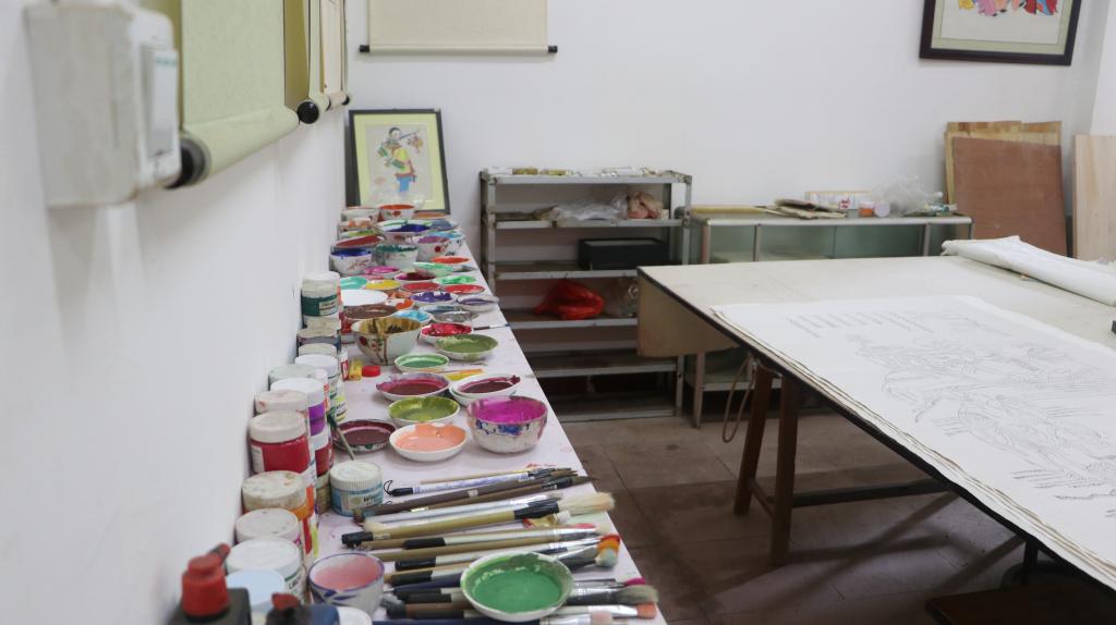 绵竹年画最大的功能当属装饰屋门了,但现在的社会早已没有这样的风俗——用纯手工制作的门神年画来镇宅。因此,绵竹年画的销量也极小。李老师介绍说,以往他们都采用绵竹特有的粉笺纸作画,颜料也几乎都是天然矿石或植物提炼制成,但当今时代的绵竹年画热度没有过去大,如若继续采用粉笺纸和天然颜料,就会造成极高的成本,于是只有在制作价值较高,且意义重大的年画时,才会选择做工繁杂但不易脱色的粉笺纸,平常的制作则采用普通的宣纸。