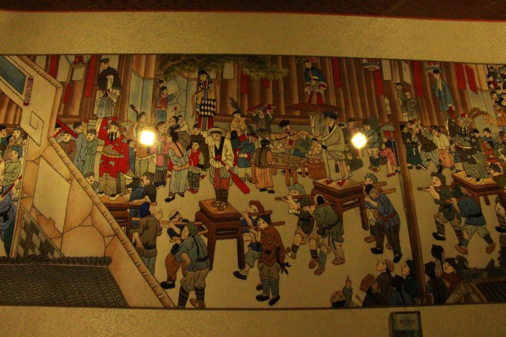 行至建筑中部,步入二楼,到达展览馆的主体部分。一改外面明亮的日关灯,而是以柔和的暖色灯光照明,辅以明清古家具、灯饰和雕花窗棂装饰,整个博物馆沉浸在端庄肃穆的环境中,彰显了设计者的不俗品味,衬托这一件件艺术的瑰宝的美。我们仔细的欣赏了每一件作品的细腻的笔触和大气的布局和它色彩鲜艳的特点。并且,我们在这里见到了长6米的刺绣版《迎春图》。《迎春图》是绵竹年画的代表作,描绘了清朝绵竹迎春会中四百多个人物和迎春活动,生动地再现了清代的民俗民风。我们在昨天的绵竹市年画博物馆也有幸见到了它的复制品。