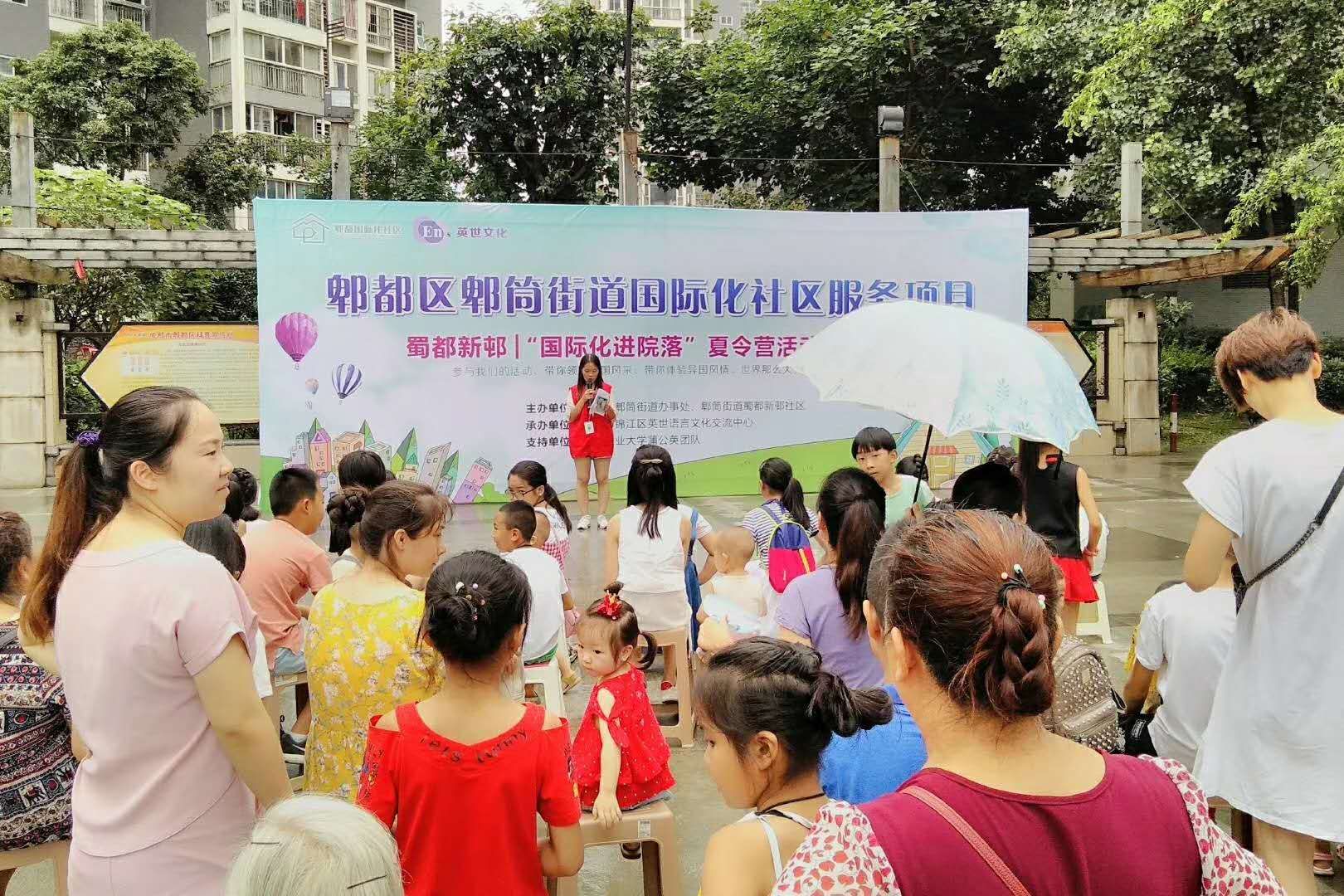 2018年7月28日上午十点整,tyc5997太阳集团蒲公英团队与蜀都新邨社区和英世文化交流中心联合举办的“国际化进院落”夏令营活动启动仪式于蜀都新邨小广场顺利进行,本次活动吸引了100余人参与。