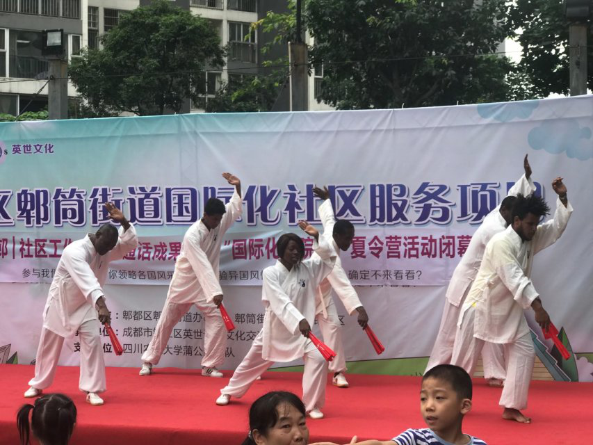 为了体现“礼尚往来”,紧接着由电子科技大学的留学生们带来了“太极表演”,现场叫好连连,中国古典文化在国际友人的演绎下别有一番风味,充分体现了中国文化的博大精深以及中外文化的深切交流。蜀都新邨的孩子们为了表示感谢和欢迎,在留学生表演结束后将自己在参与夏令营期间制作的精美剪纸赠送给他们。而后蜀都新邨孩子们也不甘示弱,与大学生实践团一起给大家带来了小合唱——《Twinkle Twinkle Little Star》。这一刻的来临,也预示着本次夏令营活动的结束,孩子们表现优秀,英世文化冯惜文理事长给每个优秀小营员都颁发了夏令营结业证书,并与外国友人们一起合影留恋,大家一起见证了这美好一刻。