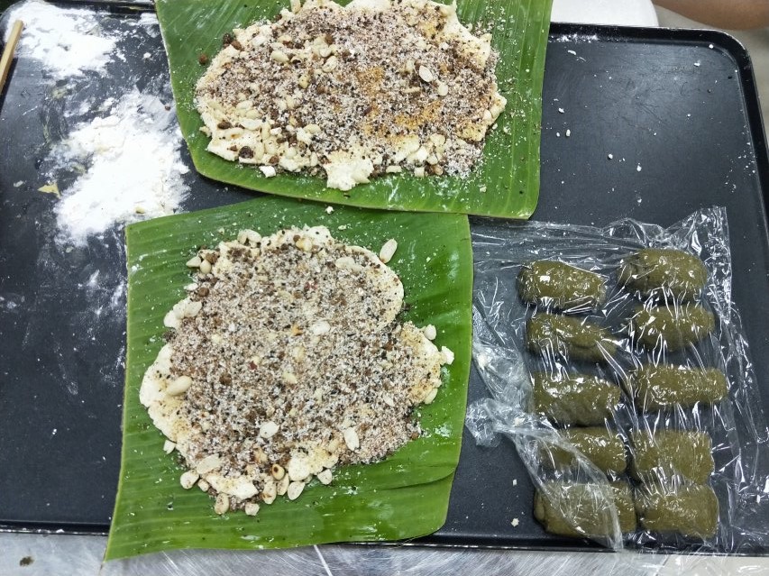 本次预实验的具体内容是在第一二次预实验的基础上进行了青叶酥制作流程和配方的改进和完善。其制作流程分为两个部分,包括酥皮制作和薏粑制作。其中,制作酥皮时,先将所需原料取一定的比例用量混匀,再加水揉成面团,最后按其质量的大小分成20~35份,盖上保鲜膜备用;制作薏粑时,同样先混匀原料,再加水,最后将花生小火翻炒去皮制成花生碎、芝麻中火转小火翻炒碾碎之后与椰蓉一同混匀放入锅中蒸15分钟后放入碗中混匀。两个部分都需注意的是,添加的水是少量的。并且,为了使后期的成品具有较高颜值,需先将备用的酥皮团揉搓一遍再将薏粑包入酥皮中,造型、贴上芝麻,然后刷油刷蛋液。