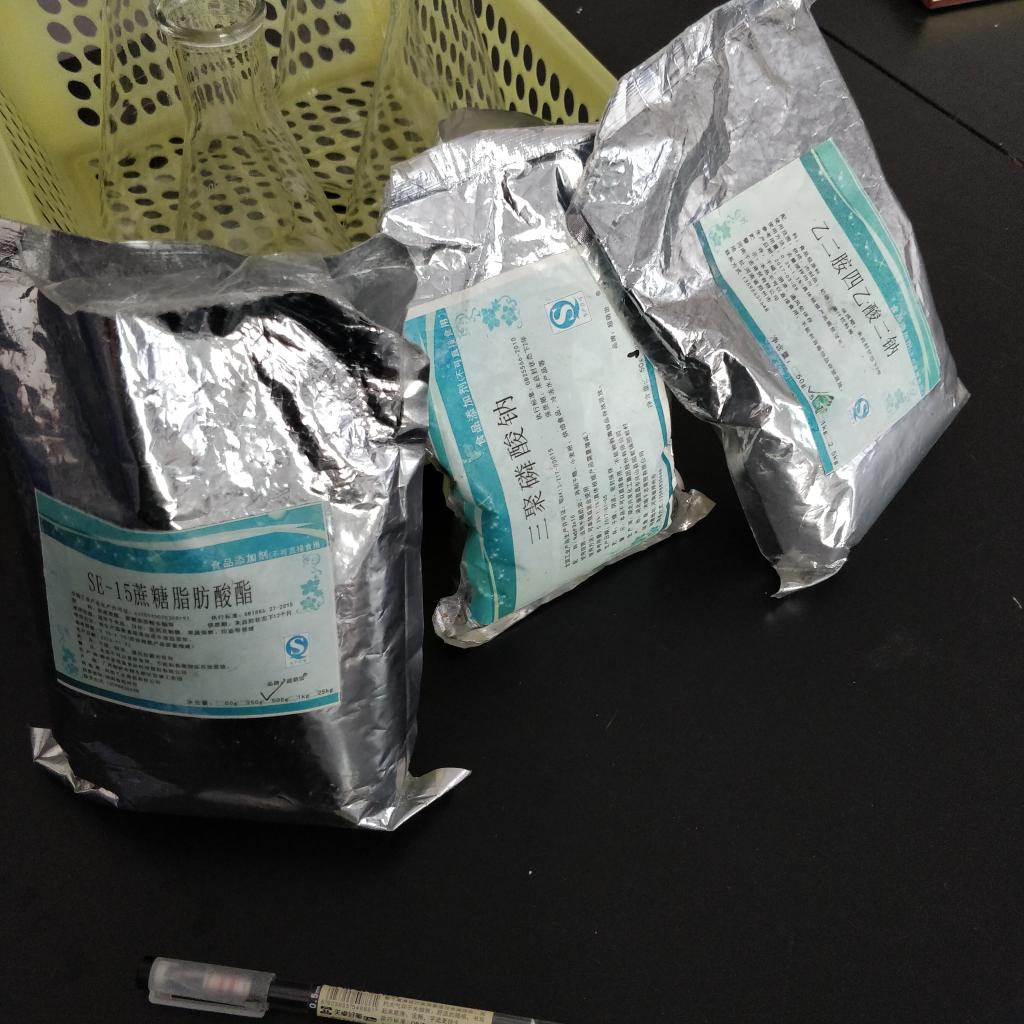 小队总结出来两种办法,第一种办法是将蕨麻等体积较大的原料预处理,分割,减小体积,让其不容易沉降;另一种办法是加入一种或几种稳定剂。为了得到更显著的效果,小队成员们决定先将原材料进行预处理,分割,减小其体积,之后再加入几种稳定剂,确定了思路之后,就马上行动。准确地称量原材料,以及稳定剂,严格对容器进行灭菌,装罐确保每一瓶都有标准含量的内容物。确保所有的处理条件与未加入稳定剂的八宝粥对照组的处理条件完全一致,通过感官评价方法,以及指标测定方法对加入稳定剂的八宝粥进行评价。
