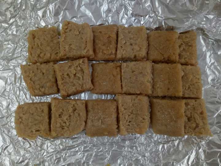 在这一天的早上,队员们首先检查批量生产所需的材料是否足够,在发现真空包装袋,高筋面粉及鸡蛋等材料不够的时候,及时去市场对材料进行补充。随后,队员们称取批量生产所需的各种材料,在经过处理之后,将各种材料混合均匀。而后,将混合均匀的材料倒入搅拌机中,搅拌至成拉丝状态,再放入磨具成形,包上锡箔纸蒸煮。最后,将成形的产品切片,油炸至两面金黄,再加入酱料翻炒,制出不同口味的产品。在生产的产品中,选取形状整齐的产品,放入印有不同口味的真空包装袋中,进行真空包装,然后,将包装好的产品放入高压蒸气灭菌锅中,在121℃灭菌15分钟,再取出产品,冷却,即产品批量生产完成。