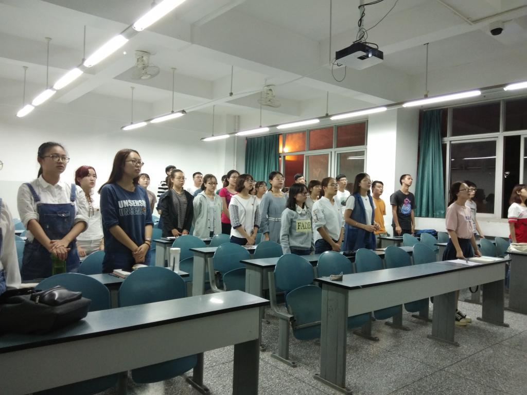 团课学习正式开始,全体同学起立齐唱团歌,接着主持人介绍了团十八大精神以及含义,让大家对团十八大有了深刻的了解。然后到了朗诵时刻,四位同学声音洪亮的朗诵了《青年志》,之后又由四位同学进行了汉字听写,紧接着,同学讲述自己认为如何做一名有志青年。接下来,主持人带大家观看了视频《青,习大大对你说》,从中同学们了解了“革命理想高于天”、“扣好人生每一粒扣子”等。最后,全体起立再次齐唱国歌,活动就此落下帷幕。