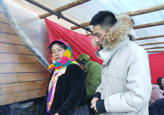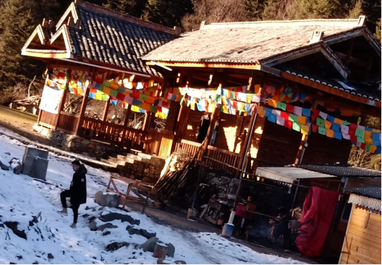 在调研过程中,团队成员与当地藏族人积极交流采访,值得一提的是,在访问交流过程中一位藏族的阿婆对团队的采访表现出极大的兴趣,并邀请团队成员到她家中做客,而在深入交谈的过程中阿婆感慨道:“现在的青年人都在往城市里面跑,村里的人户现在大都是老年人喽”。阿婆的房子是符合当地特色的林中小屋,在偌大红杉林中显得愈发小巧,周身都由圆木搭制而成。阿婆还请成员们品尝了藏族特有的酥油茶,让成员们亲身和藏香猪接触,并向成员讲述了许多藏族的传统,而在采访中,团队成员江秉棋还专门询问了沿路经幡的作用,而阿婆也向他解释道:“那是我们向上天祈福。”