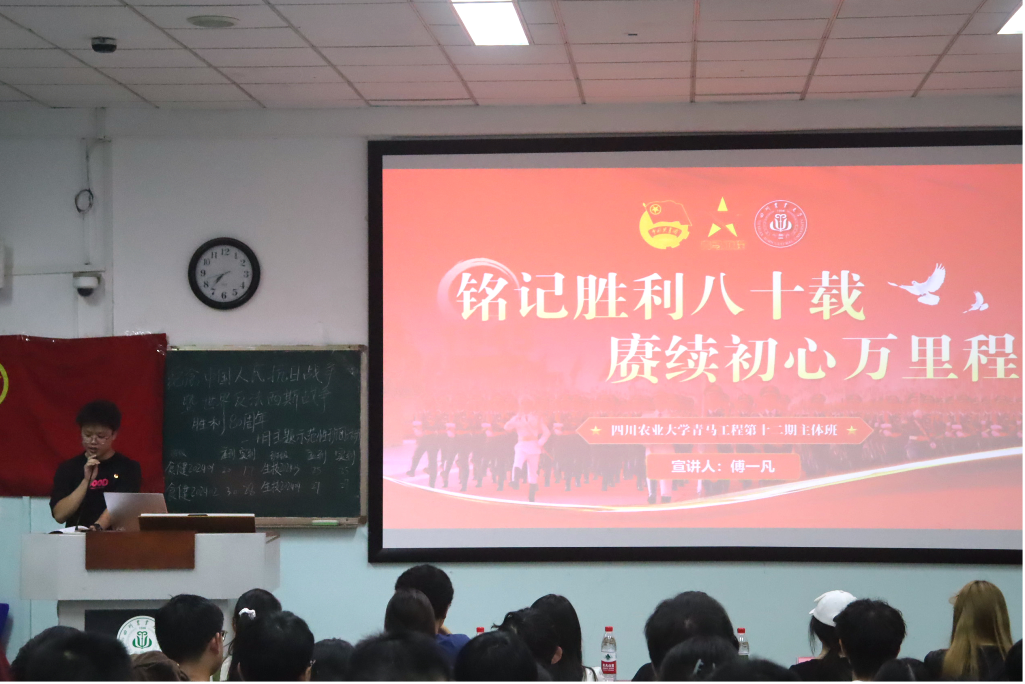 活动伊始,校青马班学员傅一凡以习近平总书记关于抗战胜利80周年的重要讲话精神为核心,向同学们阐释习近平新时代中国特色社会主义思想,介绍川农人为祖国发展作出的卓越贡献,用榜样的力量鼓励同学们以抗战精神为指引,将个人理想融入国家发展大局。