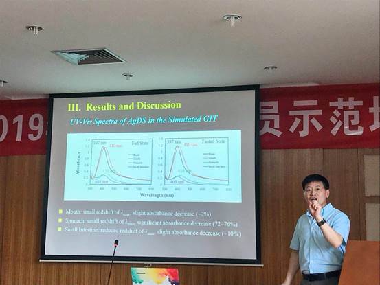 讲座中,邢宝山教授围绕“银纳米粒子在模拟人体胃肠道中的聚集、溶解状态”对膳食添加剂银纳米粒子在胃肠道内去向、转化以及形态进行了概述。讲座中,邢教授首先对银纳米粒子作为膳食补充剂以及其在食品行业中的应用研究背景以及研究动机作了较详细的讲述,并分享了自己在科研课题构建时的思考。随后对银纳米粒子在环境和食品网络中的去向以及银纳米粒子的健康风险进行了简要的分析。随后分别讲述了银纳米粒子在模拟口腔环境、胃环境、小肠环境三种环境中的聚集、溶解状态在不同模拟条件下的异同,并总结了在不同模拟环境中影响银纳米粒子形态变化的机理,对今后的研究方向做出了简要介绍。