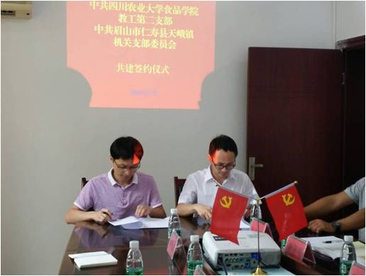 为贯彻习近平总书记关于基层党建工作系列重要讲话精神,进一步加强基层党组织建设,探索党员互动、活动互联的良性互动模式。7月10日,食品学院党委书记王莉、副院长副书记张志清、第二教职工党支部书记陈洪和教师党员代表胡欣洁一行4人前往眉山市仁寿县天峨镇,签订了食品学院第二教工党支部与天峨镇机关支部结对共建的协议。