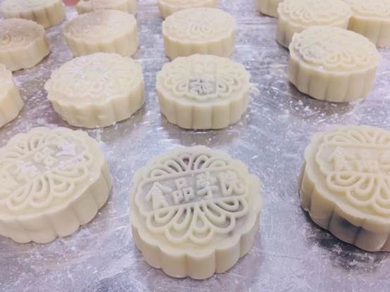 经过几场秋雨的洗礼,雨城秋意渐浓,但食品学院三教102实验室里确热火朝天,原来是食品学院党建办公室·团委·学生会的成员们正在为新生烘焙中秋美味月饼。从和面发面、称量皮馅,到包馅、压制成型、烘焙烤制、刷蛋液复烤,再到最终出炉、无菌包装等一系列步骤均是由师兄师姐们亲自完成,他们严格把控每一个环节,比例、温度、湿度和力度,每一个细节都尽力做到完美,每一枚月饼都承载着满满的祝福。成品色泽金黄诱人、花纹整齐别致、馅料种类丰富,紫薯、玉米、豆沙、莲蓉、五仁等口味让人垂涎,个头大、用料实,捧在手里沉甸甸。饼面印着的楷体大字“食品学院”,独具特色。这已经是食品学院连续第六年给新生做月饼,今年共制作了1200余枚月饼,总耗时2天,参与人数达百余名,为保证质量与口感,他们还邀请学院烘焙俱乐部成员全程指导制作。