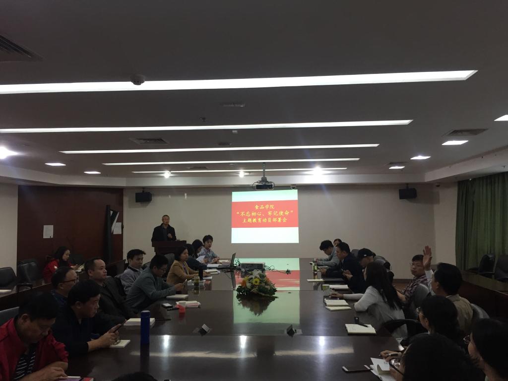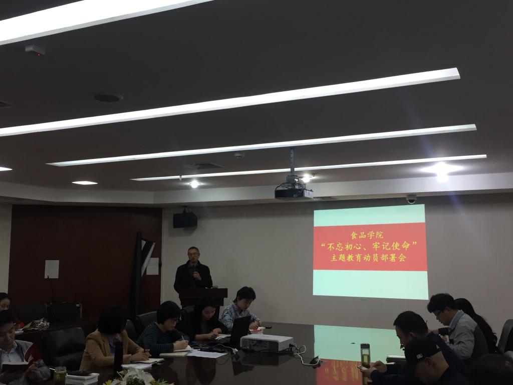 学院党委书记曾小波做动员讲话。他传达了学校召开“不忘初心、牢记使命”主题教育动员部署会的会议精神,要求广大教师党员要牢记入党誓词,增强身份意识,提高政治觉悟,践行中国共产党人的初心和使命。他指出广大教师要读原著、学原文、悟原理,认真修读十九大报告中提出的八个明确,深刻理解习近平新时代中国特色社会主义思想的重大政治意义、理论意义、实践意义和世界历史意义;全体党员要充分利用好“学习强国”学习平台强化政治学习,各系所室、各科研团队要将实际工作与“不忘初心、牢记使命”主题教育相结合开展调研讨论,深刻领悟以习近平同志为核心的党中央统揽伟大斗争、伟大工程、伟大事业、伟大梦想的重大战略意义。围绕“培养什么人、怎样培养人、为谁培养人”这个根本问题,他要求全院教师结合自身工作,学习“不忘初心、牢记使命”优秀共产党员焦裕禄、黄大年等的先进事迹,不断丰富我们的精神内涵,增强对人才培养、对教育事业的责任感和使命感,逐渐将个人事业与党和国家的事业融合在一起,以高度负责的态度、求真务实的精神,认真贯彻落实党中央、省委和学校的决策部署,积极推动主题教育往深里走、往心里走、往实里走,争做“四有”好老师,以优异成绩迎接新中国成立70周年。他强调全院领导干部、教师党员要贯彻守初心、担使命、找差距、找落实的“十二字”总要求,结合学院和自身实际,找准问题差距,深刻剖析原因,克服各种困难,承办好2019年中国农业工程学会农产品加工及贮藏工程峰会学术年会,集全院之力为学科博士点申报和“双一流”专业建设做好准备,凝心聚力,团结拼搏,推动学院发展上新台阶。