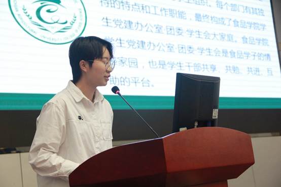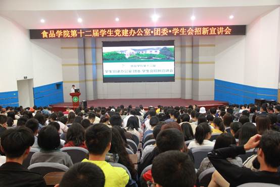 10月7日晚7时30分,食品学院第十二届学生党建办公室·团委·学生会招新宣讲会于逸夫楼小礼堂顺利举行。学院学生会主席周茜,学生党建办公室副主任朱婷钰、学生团委副书记王笑、卢宇咫,学生会副主席邓特希出席大会,会议由朱婷钰主持,各学生组织主要负责人到场宣讲,19级新生及各班班助与会聆听。