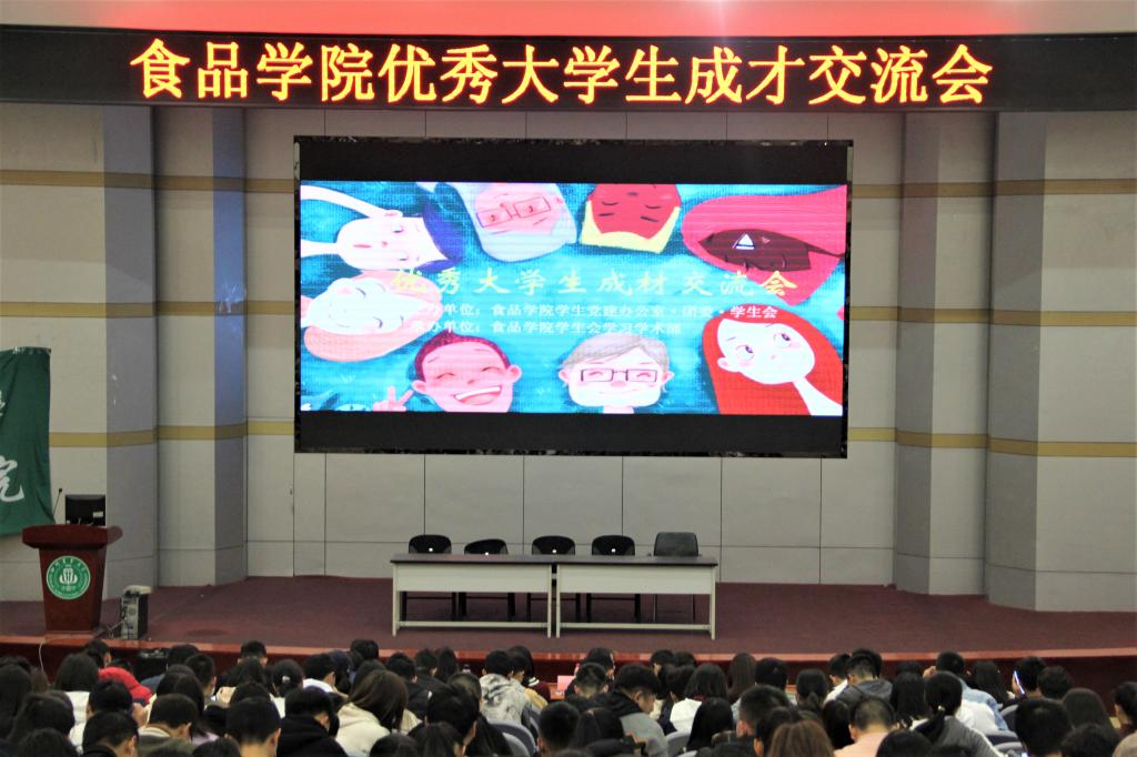 10月27日晚,由食品学院学生党建办公室·团委·学生会承办的“优秀大学生成材交流会”于逸夫楼小礼堂顺利举行,2016级优秀学生王玥、杜沁岭、冯诗艺、倪龙、唐林受邀莅临现场,向食品学院2019级400余名新生分享学习心得以及人生经验。会议由学院学习学术部张冰主持,现场气氛活跃,同学们认真听讲,积极提问,优秀学生热情分享,耐心讲解。