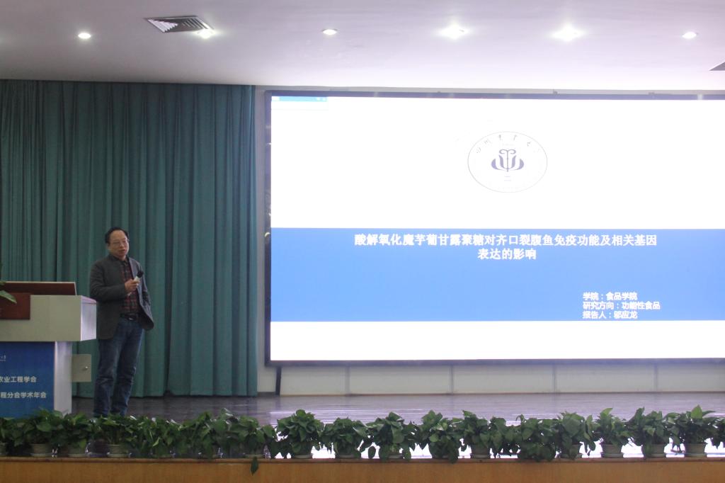随后,我院邬应龙教授就“酸解氧化魔芋葡甘露聚糖对齐口裂腹鱼免疫功能的影响”作了精彩分享,从多糖和寡糖对鱼类肠道菌群及免疫功能的研究出发,以详实的实验数据展示了不同剂量AOKGM对齐口裂腹鱼生长及脏器指数、免疫参数、以及1.6%AOKGM对感染嗜水气单细胞菌后齐口裂腹鱼血清相关免疫参数和免疫相关基因的影响。在降糖降脂的作用的基础上,为齐口裂腹鱼的精深加工提供了研究方向。